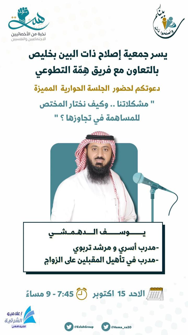 بشراكة مع ⁧‫# إعلاميو الشرقية‬⁩ تدعوكم جمعية إصلاح ذات البين بخليص بالتعاون مع فريق همة التطوعي لحضور الجلسة الحوارية والتي يقدمها المدرب الأسري والمرشد التربوي الأستاذ يوسف الدهمشي بعنوان : (مشكلاتنا .. وكيف نختار المختص للمساهمة في تجاوزها؟) وذلك يوم غدٍ الأحد الموافق 15 أكتوبر.